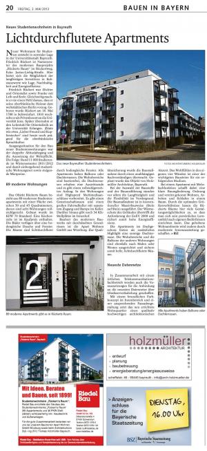 LICHTDURCHFLUTETE APARTMENTS Neues Studentenwohnheim in BayreuthVerlag Bayerische Staatszeitung GmbH - Bay. Staatszeitung Nr.1813.05.2013Inhalt des PresseartikelsLICHTDURCHFLUTETE APARTMENTS Neues Studentenwohnheim in Bayreuth Zeitungsausschnitt vom 03.Mai 2013 Quelle: Verlag Bayerische Staatszeitung GmbH Arnulfstr. 122 80636 München Web: www.bayerische-staatszeitung.de Projekt zu Artikel:: Bayreuth- Wohnanlage mit 89 Studenten Apartments