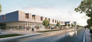 Vor dem Hangar entsteht ein großer Neubau mit verschiedenen Märkten, Geschäften sowie einer Bankfiliale.